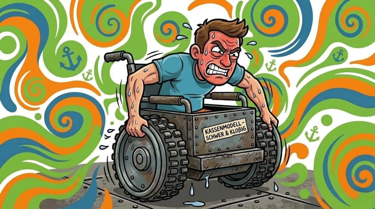 Die Physik dahinter ist ein Albtraum: Die Antriebsachse ist meist so weit hinten fixiert, dass du beim Versuch, die Vorderräder für einen Randstein anzuheben, eher einen Bandscheibenvorfall kriegst, als dass sich der Rolli auch nur einen Zentimeter bewegt. Das Gewicht zieht dich gnadenlos nach unten, die unförmigen Seitenteile quetschen dich ein, und optisch siehst du darin aus, als wärst du auf dem Weg zur Visite in der Geriatrie.